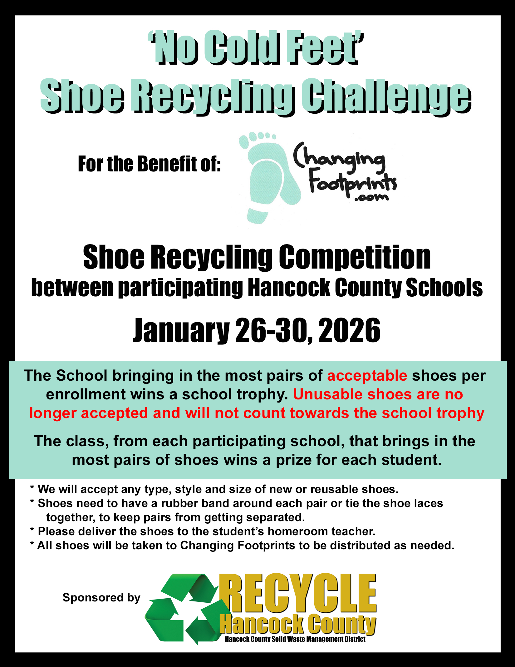 Update due to Weather - We are extending our shoe collection into next week! Â Shoes can be collected and counted until Thursday, February 5th!